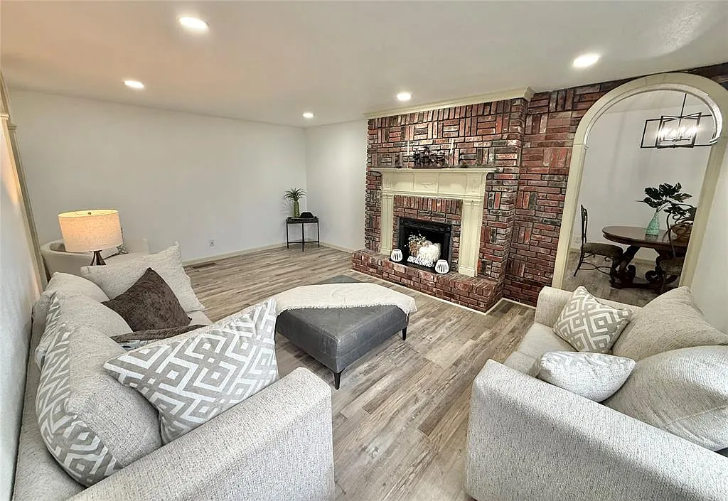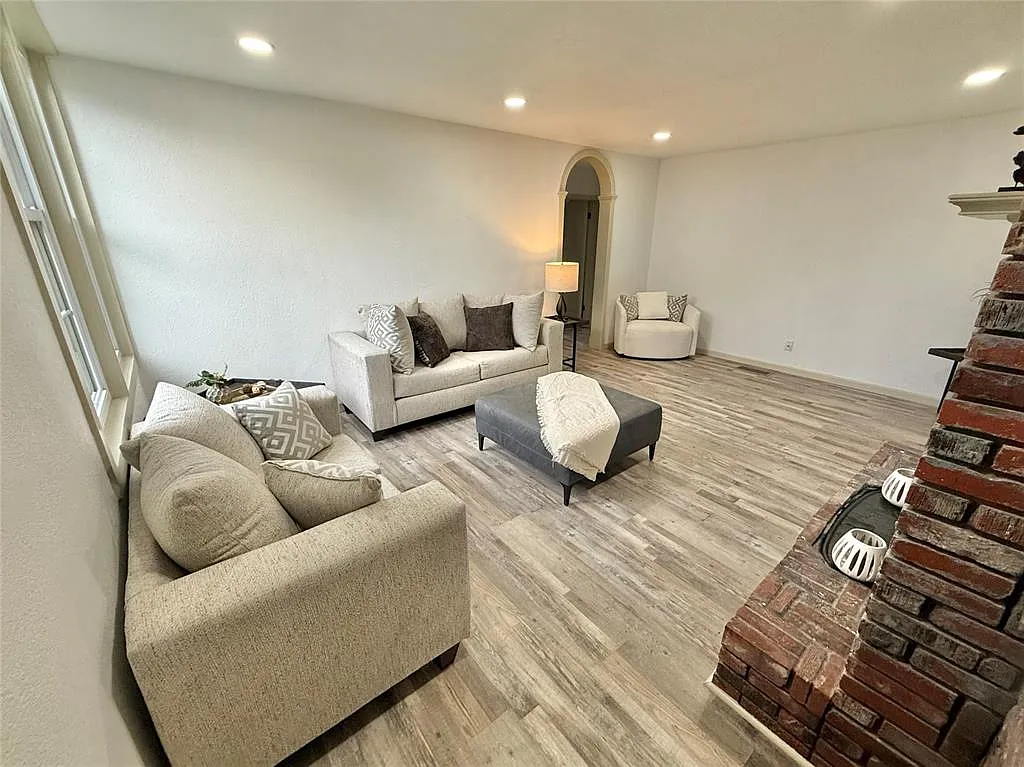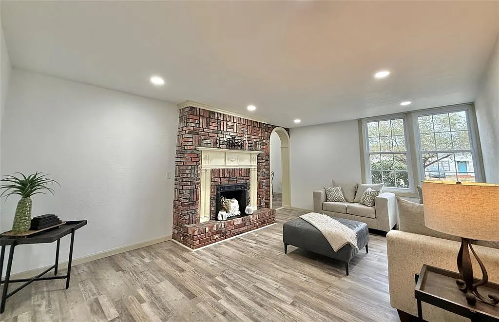 The interior showcases tall ceilings, an open-concept layout, and two separate living areas, each anchored by a cozy fireplace that adds warmth and character. Every detail has been carefully updated, blending classic architectural elements with today’s modern finishes. Generously sized bedrooms include large closets, providing ample storage throughout.
